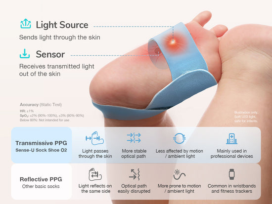 The latest Sense-U Smart Sock Shoe O2 now features advanced transmissive PPG technology for improved measurement accuracy, enabling more precise tracking of your baby’s heart rate, oxygen levels, and sleep patterns — offering parents added confidence and clarity.