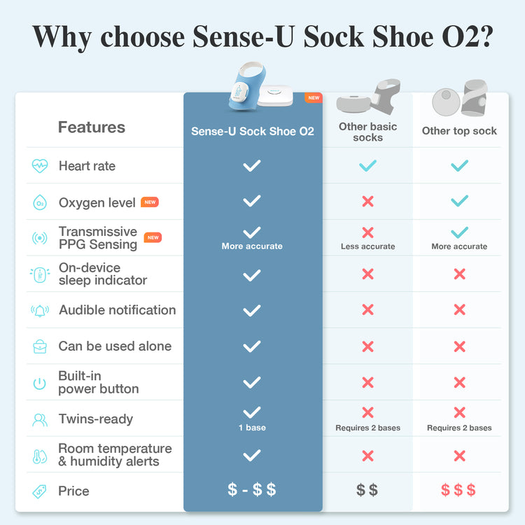 • TRANSMISSIVE HEART RATE & OXYGEN SENSING WITH IMPROVED ACCURACY: The all-new Sense-U Smart Sock Shoe O2 uses advanced transmissive PPG sensing technology for enhanced accuracy when tracking your baby’s heart rate, oxygen levels, and sleep patterns, helping you better understand your baby’s rest.