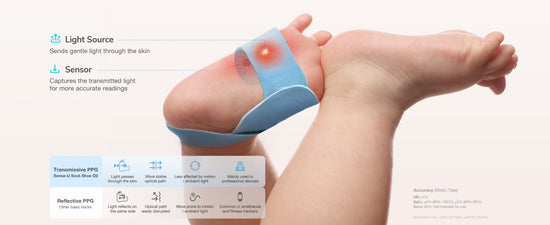 • TRANSMISSIVE HEART RATE & OXYGEN – IMPROVED ACCURACY FROM ANYWHERE: Powered by advanced transmissive PPG technology, the Sense-U Smart Sock Shoe O2 accurately tracks your baby’s heart rate, oxygen levels (SpO₂), and sleep patterns, helping you stay informed about your baby’s rest from anywhere.