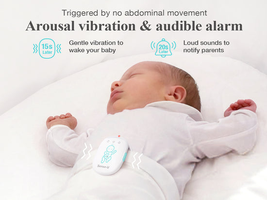 Wenn nach 15 Sekunden keine Atembewegung erkannt wird, vibriert das Sense-U Babyphone Pro sanft, um Ihr Baby zunächst aufzuwecken. Wenn weiterhin keine Bewegungen erkannt werden, ertönt ein akustischer Alarm.