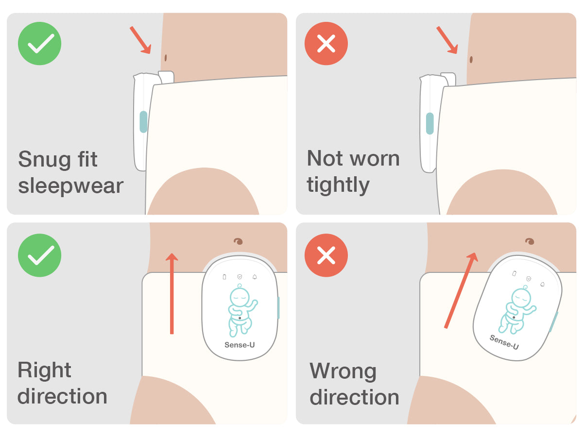 Align the baby icon with your child's body and attach the device next to the belly button. Wear snug-fitting clothes for accurate monitoring.