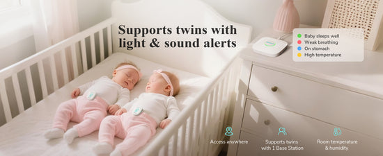 The Base Station supports light and sound alerts, twin monitoring, and room temperature/humidity tracking with alerts.