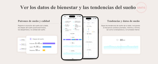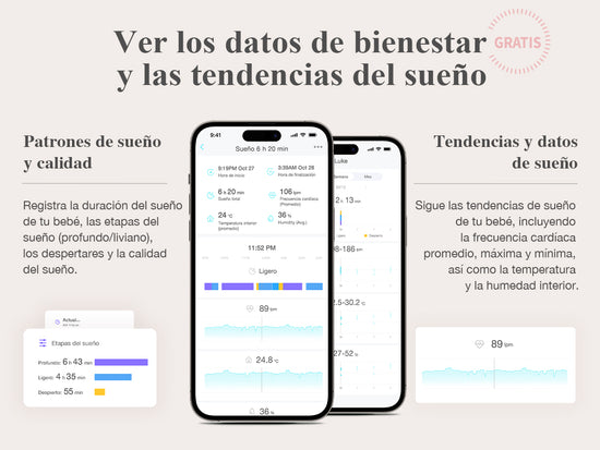 Obtenga información detallada más allá de los datos de sueño estándar, incluida la frecuencia cardíaca y el movimiento durante el sueño, para un control más sencillo del bienestar y una mejor comprensión de los patrones de sueño de su bebé.