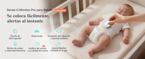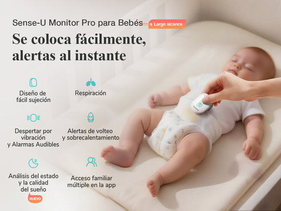 Desde cualquier lugar, el monitor para bebés Sense-U Pro (de largo alcance) detecta la causa del posible malestar durante el sueño —como una respiración lenta, dormir boca abajo o el sobrecalentamiento— en lugar de solo el efecto, como una frecuencia cardíaca baja. Esto te brinda alertas más rápidas ante posibles problemas relacionados con el sueño que los monitores de frecuencia cardíaca. La tranquilidad proviene de su rápida vibración en el dispositivo para despertar al bebé, alarmas audibles, notificaciones en la aplicación y análisis detallado del sueño, ayudándote a garantizar la comodidad del bebé, un mejor descanso.