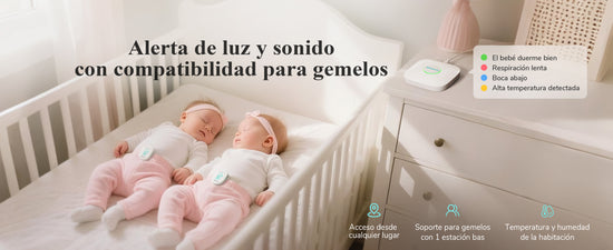 La Estación Base admite alertas luminosas y sonoras, monitoreo de gemelos y seguimiento de la temperatura/humedad de la habitación con alertas.