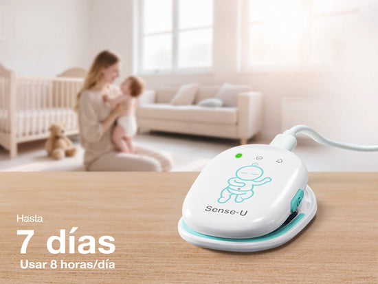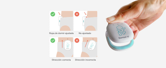 El recién diseñado monitor inteligente para bebés Sense-U Pro de largo alcance se coloca fácilmente en el pañal o los pantalones de tu bebé con una sola mano.