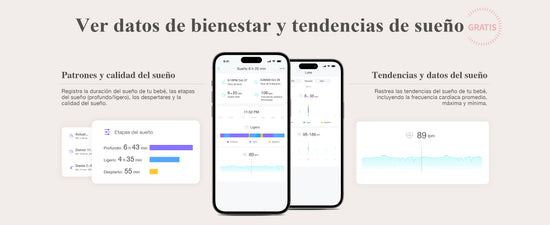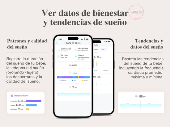 Obtenga información detallada más allá de los datos de sueño estándar, incluida la duración del sueño de su bebé, el sueño profundo/ligero, las siestas, la eficiencia y los despertares, para un fácil monitoreo del bienestar y una mejor comprensión de la calidad del sueño de su bebé.