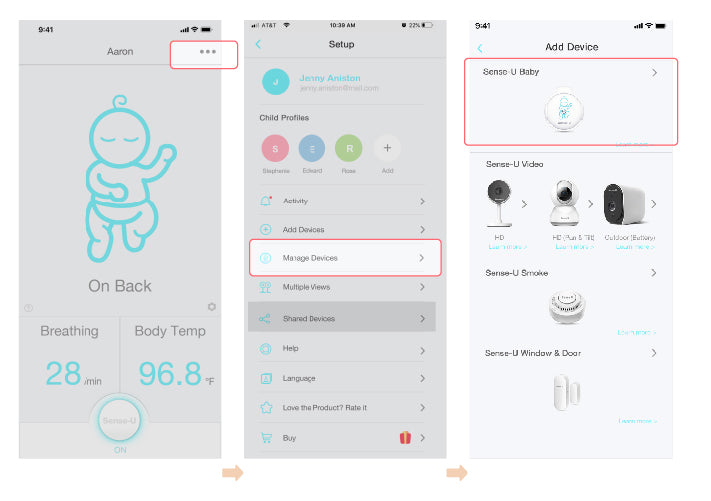 1.ベビーデバイスをダブルシェイキング(2度揺らす)しペアリングする前に、ベースステーションが 緑色 に点滅していることを確認してください。もし点滅が確認できなかった場合は、 Sense-Uアプリの設定->デバイスの管理->端末の追加より設定を行ってください。.