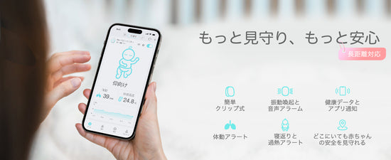 ロングレンジ版のSense-Uベビーモニタープロは赤ちゃんのオムツやパンツに簡単にクリップでき、腹部の動き、睡眠姿勢、体感温度を追跡し、覚醒振動、音声アラート、アプリ通知を提供します。
