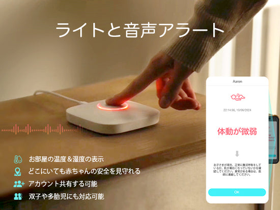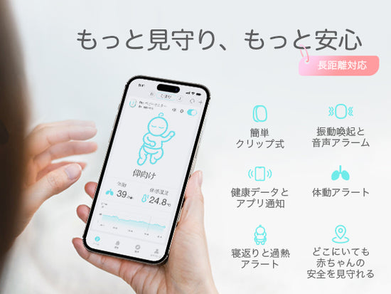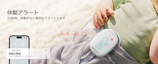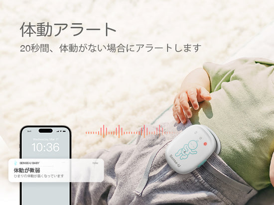 腹部の呼吸運動が15秒間検出されない場合、Sense-Uベビーモニタープロはまず優しく振動して赤ちゃんを起こそうとします。それでも動きが検出されない場合は音声アラームが鳴り、アプリを通じてスマートフォンに通知が送られます。