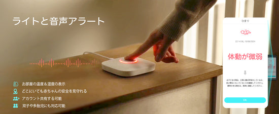 ベースステーションにはライトとサウンドアラートがあり、どこからでもモバイル通知でお知らせします。また、双子にも対応し、部屋の温度と湿度レベルも音声アラートで追跡します。