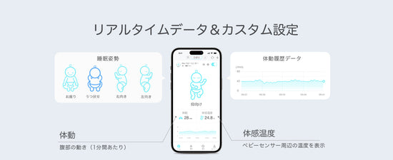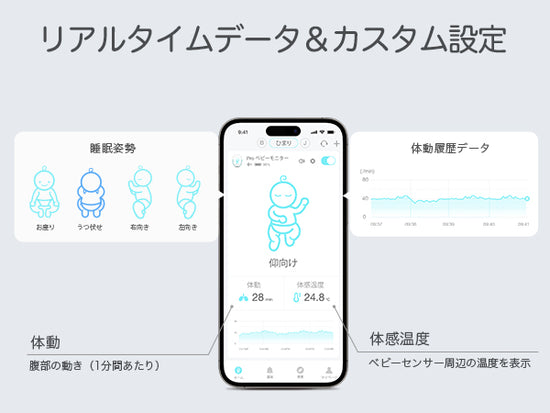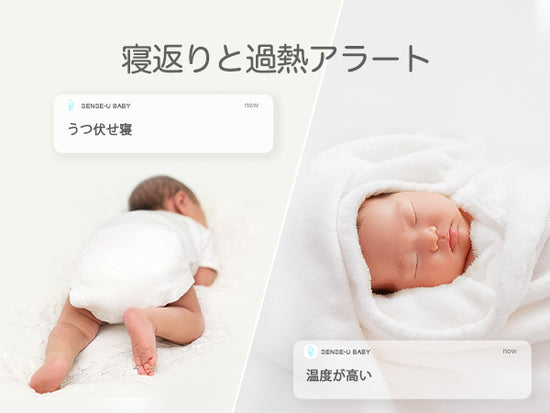 健康な新生児の場合、常に適切な温度で背面に寝かせることが推奨されています。Sense-Uスマートベビーモニタープロは赤ちゃんの寝姿勢と感覚温度を追跡し、寝返りや過熱に対する音声およびアプリの警告を提供します。