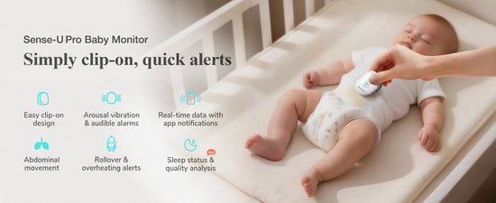 • SIMPLY CLIP-ON, QUICK ALERTS FOR BETTER SLEEP: The Sense-U Pro baby monitor clips easily onto your baby’s diaper and detects the cause of potential sleep discomfort—such as slow breathing movement, stomach sleeping, or overheating—rather than only the effect like lower heart rate. This enables faster, more reliable alerts compared to traditional heart rate monitors.