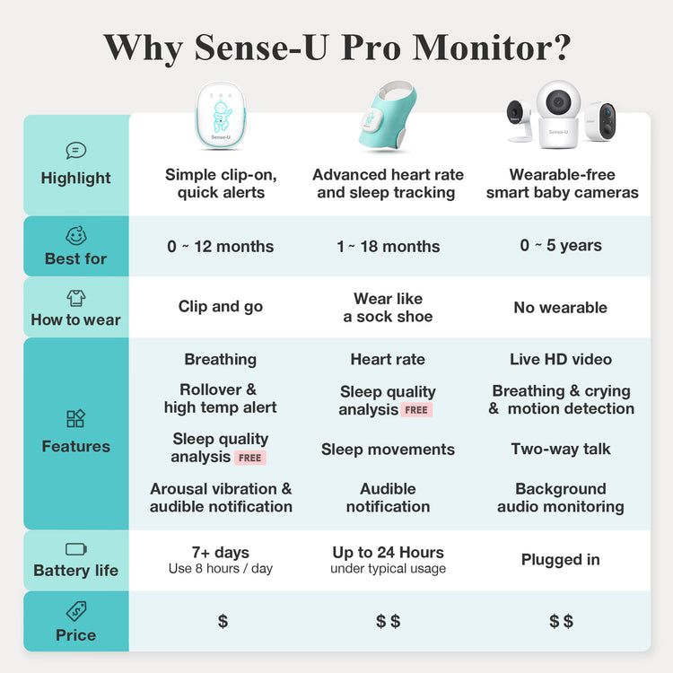 The Sense-U Pro baby monitor detects the cause of potential sleep discomfort—such as slow breathing, stomach sleeping, or overheating. Peace of mind comes from on-device arousal vibration, audible alerts, and fast app notifications, sleep analysis—helping ensure your baby's comfort and better sleep.