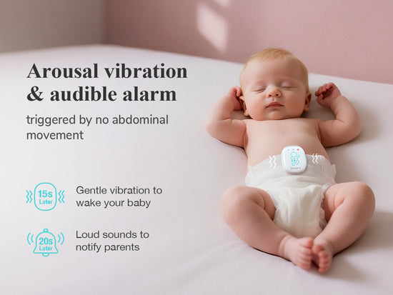 After 15 seconds of no breathing movement detected, the Sense-U Pro Baby Monitor will gently vibrate in an attempt to wake up your baby first. If still no breathing movements are detected, it will sound an audible alarm, and send a notification to your smartphone via the app.