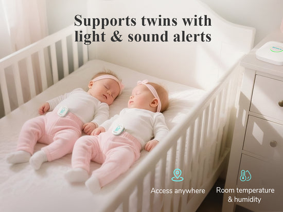 The Base Station supports light and sound alerts, twin monitoring, and room temperature/humidity tracking with alerts.